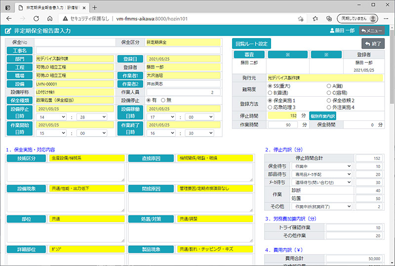 - 故障や突発作業に伴う保全報告書作成とその検索